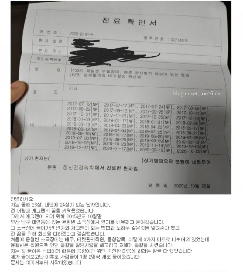 A 씨는 2015년 10월 말부터 윤형빈 소극장에 연기를 배우기 위해 입단했는데 극장 내 관계자들이 폭언과 폭행을 일삼는 바람에 윤형빈은 방조했다고 주장했다.