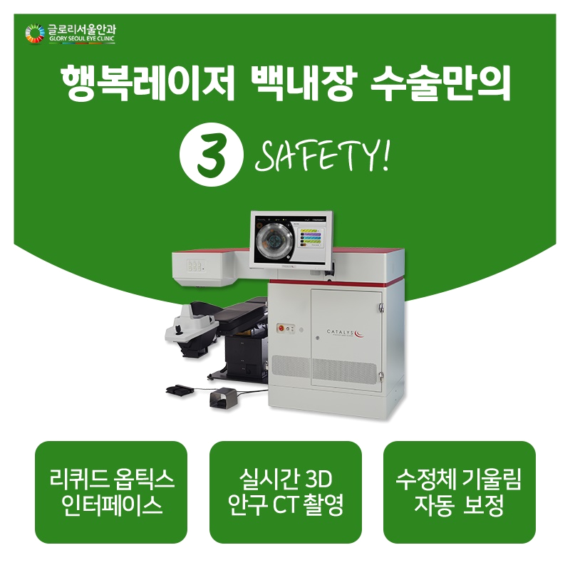 백내장 치료는 현재 레이저를 통해 이루어지고 있지만 마이크론 단위까지 측정이 가능한 카탈리스 시스템을 이용하면 곧 개선과 회복을 기대할 수 있습니다 카탈리스 레이저는 내장된 입체 CT촬영을 바탕으로 개개인의 안구상태를 실시간으로 수집, 반영하여 정확도와 안전성을 확보하고 있으나 통증이 적고 개선시간이 짧아 치료에 대한 부담이 있는 분도 있을 수 있습니다.뿐만 아니라 각막 손상이 적은 만큼 각막 부종, 각막 혼탁 등의 후유증이 거의 발생하지 않아 안정적으로 눈을 회복할 수 있고 레이저를 이용한 치료를 시행하기 때문에 염증이나 감염 등의 2차적인 문제도 눈에 띄게 줄어들었습니다.