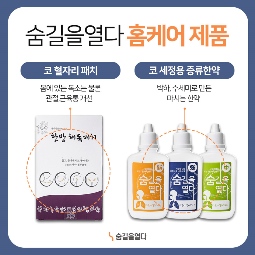 숨길 뚫는 한방병원에 가지 않는 동안 언제 어디서나 코 점막을 관리할 수 있도록 홈케어 제품도 제공해 드립니다. 코피자리 패치는 코 주변에 붙이는 패치로 코와 그 주변의 부비강 내 림프 순환을 도와주고 수면 시 비강 호흡에 도움을 줍니다. 코세척 증류 한약 은하수는 코로 먹는 한약입니다. 코 점막의 염증을 완화시켜 주고 습도를 조절해 줍니다.또한 목 뒤로 삼켜도 인체에 부담이 적습니다. (* 환자의 상태에 따라 처방 및 지점별로 치료 과정이 달라질 수 있습니다.)