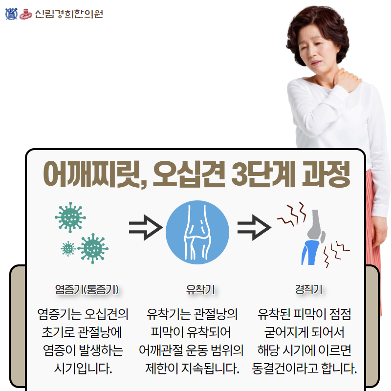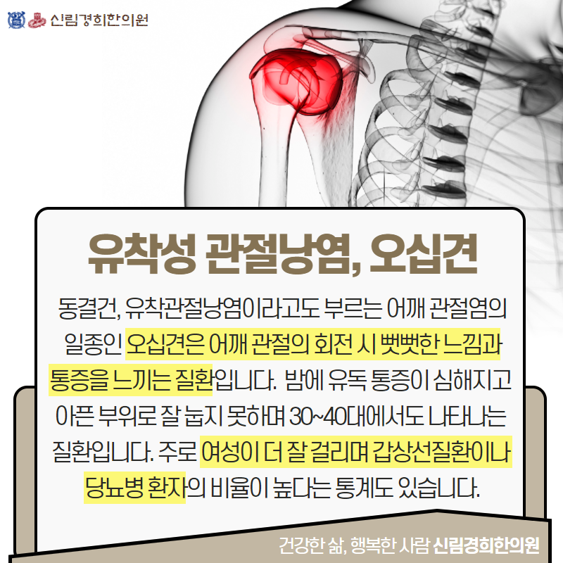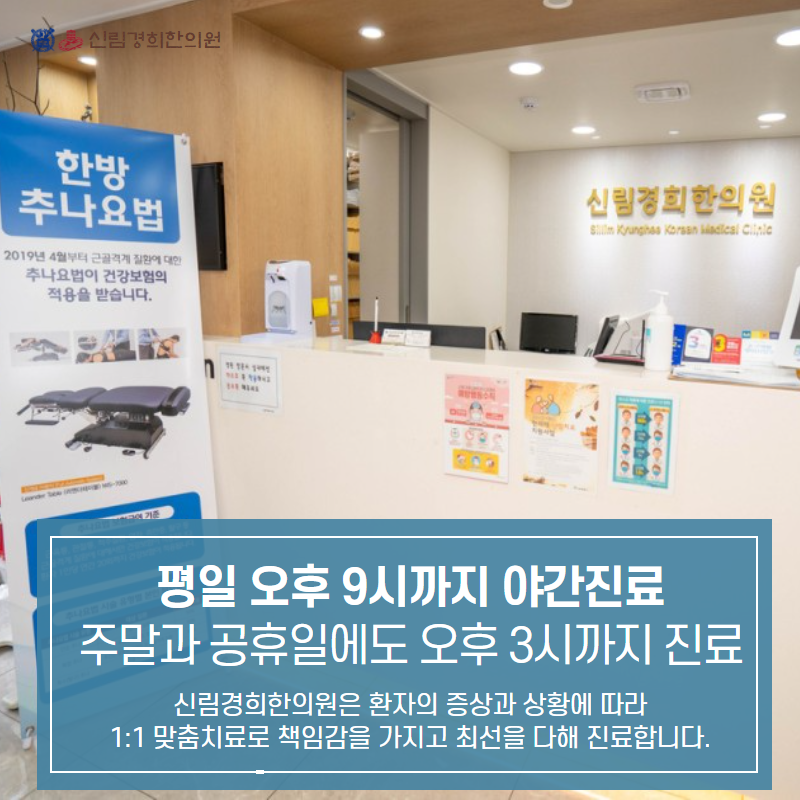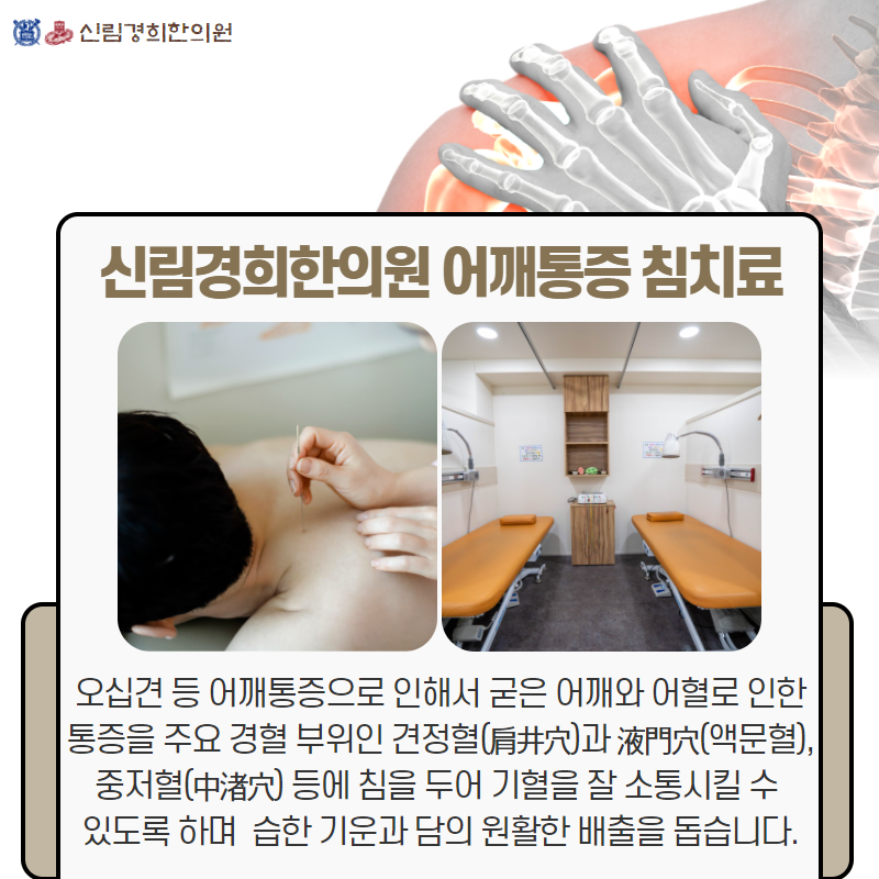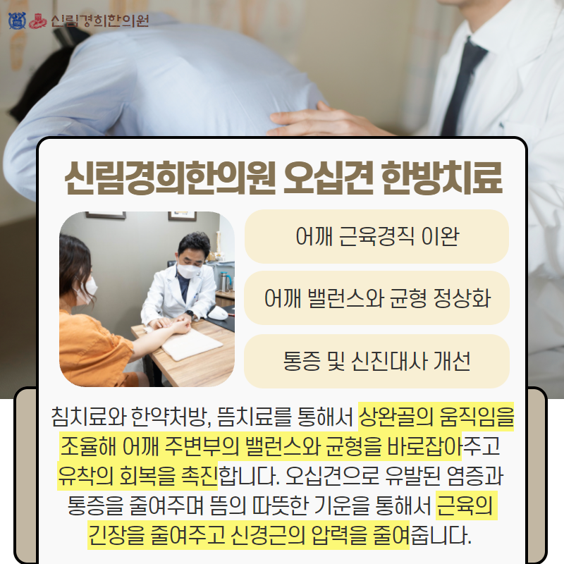 오십견으로 인한 불편함이 더 커지기 전에 신림경희한의원에 내원하셔서 조기에 적절한 대처를 통해 통증을 줄이고 증상에 맞는 한방 솔루션을 받아보시기 바랍니다.서울특별시 관악구 초원로16길 33 중앙빌딩 1층