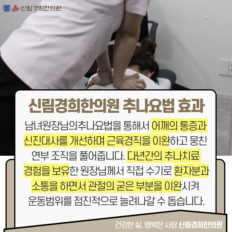 신림경희한의원에서는 오랜 추나요법 경험을 가지고 있는 원장님이 직접 물리적인 힘과 밀당기기 등을 이용하여 관절 부위의 뻣뻣해지는 부분을 풀어드립니다.