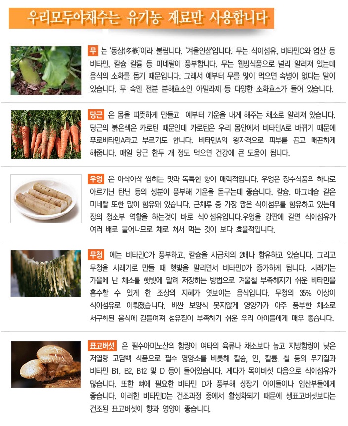채소물뿐만 아니라 현미차와 홍삼도 나옵니다.모든 제조식품이 정기적으로 시험검사를 하여 안전한 제품을 생산하고 있기 때문에 신뢰할 수 있는 업체라고 생각합니다.후후