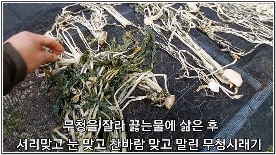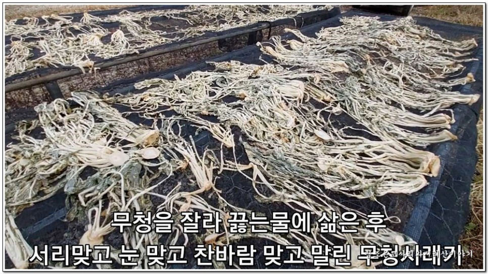 순무청 시래기는 끓는 물에 삶아 야외에서 말리는데 서리를 맞고 눈을 맞아 찬바람에 마르고 식이섬유와 미네랄이 풍부해져 아주 부드럽고 맛도 좋아지는 나물입니다.