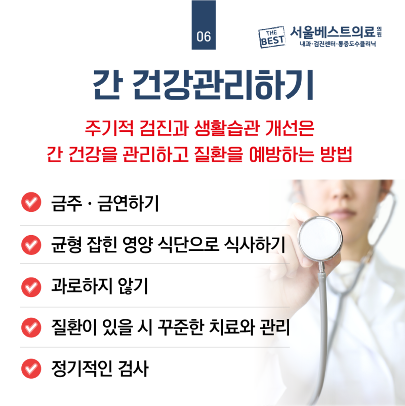 평소 맵고 짠 자극적인 음식과 술을 자주 마시면 우리 몸에 콜레스테롤, 지방 등 지질이 쌓이고 대신 체내에 필요한 필수 영양소는 점점 줄어듭니다.이런 일이 반복되면 간에 지방이 쌓이면서 간 기능까지 저하될 수 있습니다.또 간 건강이 나빠지면 전반적인 신체 건강까지 무너질 수 있습니다.(생각보다 우리 몸에서 간이 하는 역할이 매우 큽니다.)