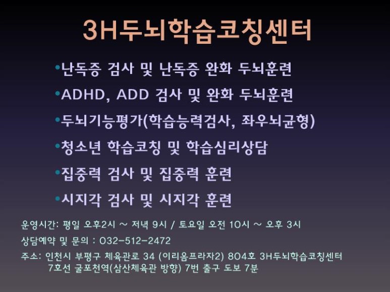 주의력,집중력,인천,송도,#부천,두뇌학습,난독증,ADHD,ADD,두뇌기능평가,IQ테스트,좌뇌,우뇌,청지각,뇌훈련,3H두뇌학습코칭센터,0325122472,청지각훈련,청소년,학습코칭,우울증,학습심리,#임부태교,불면증,주의력,인천,부천,두뇌학습,난독증,AD,ADD,두뇌기능평가,좌뇌지능평가,좌뇌테스트,325122472친구,우울증,학습심리,임부태교불면증,ADD,집중력,ADD,집중력,뇌독,AD,어쩌다,손톱,깨무는아이,손톱깨무는아이,삼산동.언어치료,언어,언어발달,부천,계양,산곡,상동,중동,삼산,부개,발달,청지각훈련,#틱장애,#투렛증후군학습코칭,학습코칭,청소년,학습코칭,학습심리,집중력,시각,학습코칭 #부천난독증 #부평난독증치료