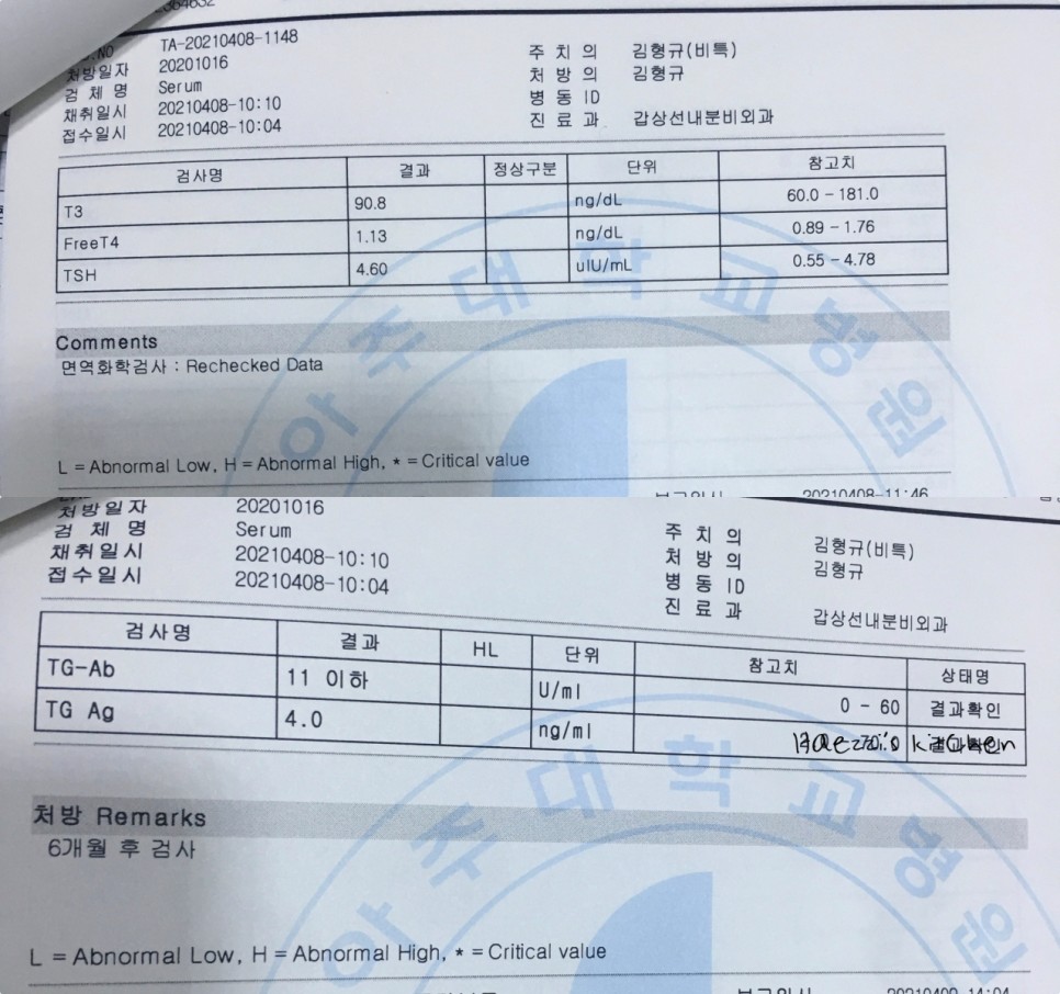 그리고 위의 사진은 아주 대학 병원의 21 년 4 월에 피검사한 결과입니다.T390.8 / Free T41.13 / Tsh 4.60 나왔어요덧붙여서 수술전에는 tsh 수치가 6정도였습니다.# 갑상선 저하증에 가까운 편이래요. tsh 수치가 갑자기 올라갔네요 ( ´ ; ω ; ` )