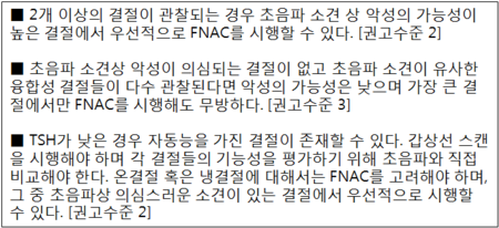 - 병력청취와 신체검사 – 환자의 연령이 높거나 나이가 어릴수록 악성(암)일 가능성이 높으며, 20세 이하 환자에서 단일성 갑상선 결절 악성 가능성은 20~50%로 알려져 있음 – 여성보다 남성에서 갑상선 결절과 암 빈도는 남성보다 여성에서 높음 – 갑상선수암(Medullary thyroid carcinoma, MTC)에서는 가족성에서 갑상선암이 발생할 수 있으므로 상세한 문진을 하여야 함 – 음성장애, 음성변화, 연하장애 등의 증상은 통증 등의 증상은 깊이 주의하여야 하며, 통증 등의 증상은 주의하여야 한다.