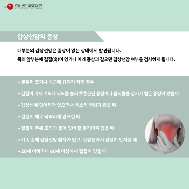 목소리가 바뀌거나 목에 이물감, 붓거나 호흡곤란 등의 증상이 조금이라도 느껴지거나 갑상선 증상이 의심되면 즉시 내원하시기 바랍니다.