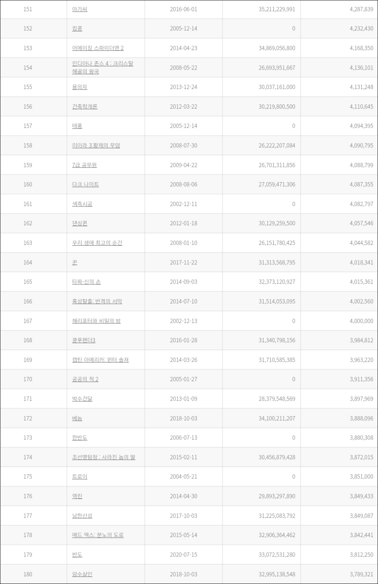 □ 이미지 출처 : 네이버 영화정보 □ 통계자료 : 한국영화진흥위원회 – KOBIS 영화관입장권 통합전산망 – 공식통계 – 역대 박스오피스 (전체)