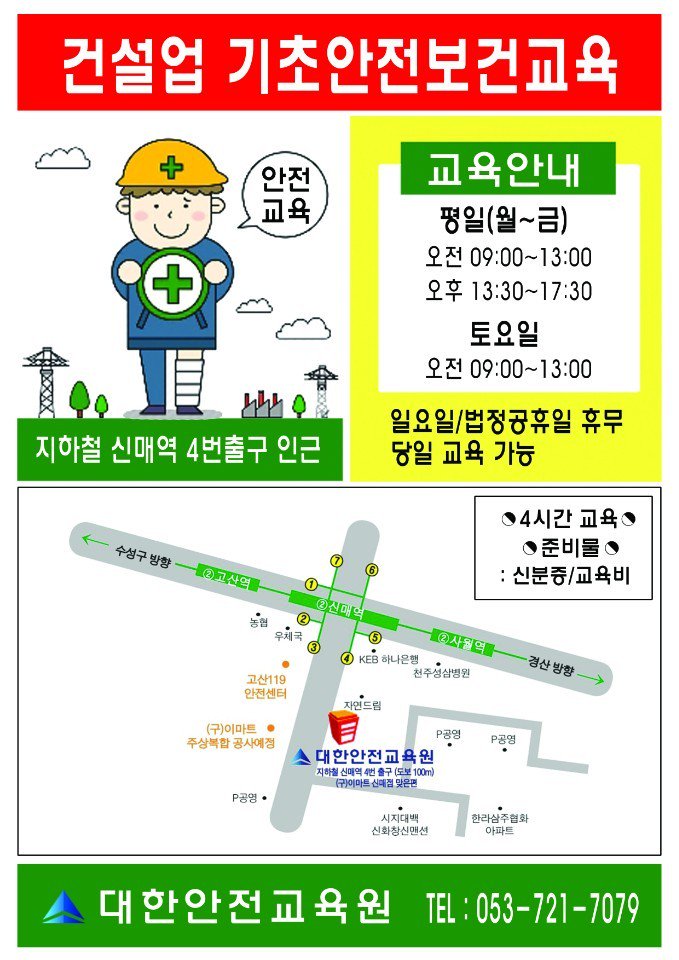 건설업 기초 안전 교육을 받는 장소의 위치입니다.대구광역시 지수성구에 교육을 받는 곳입니다.교육을 실시하는 곳이며 대구경북지역 건설업 기초안전교육을 전문적으로 실시하고 있습니다.산업안전공단 등록노동부 허가를 받은 법적 교육기관입니다.S등급 최상위 등급의 교육장입니다.재발급 관련하여 온라인 확인 및 조회가 가능하며 이수증 카드 실물이 필요하신 분은 타 지역 수도권, 부산, 전라북도권에서 교육을 받으신 분 혹은 폐업한 기관에서 교육을 받으신 분은 재발급은 해당 기관에 사전 문의하여 방문하셔야 합니다. 만약 해당 기관이 폐업한 경우 안전공단에 문의하시기 바랍니다.재발급에 관해서는 사전에 문의나 시간 약속을 하고 방문해 주시기 바랍니다.기초안전교육증 건설기초안전교육경비비용 건설산업현장이수카드 건설안전보건교육 건설산업현장교육