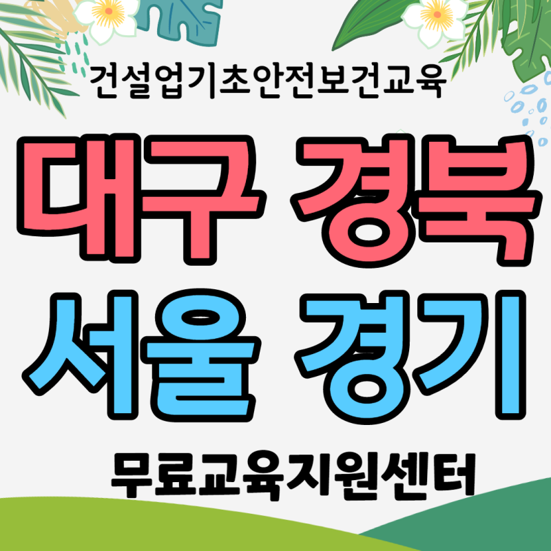 8월 18일 오늘은 즐거운 아침입니다.어제 비가 많이 와서 그런지 시원한 아침인 것 같아요.추석 전 열심히 일하기 위해 채용공고 및 구직활동을 하시는 분들의 교육 관련 아래 내용을 참고하시기 바랍니다.건설업 기초 안전 교육 대구시 지교육감 교육을 받는 곳입니다.그럼 무료교육, 그리고 준비물교육 시간, 어떤 교육인지 한번 살펴보도록 하겠습니다.건설현장에서받는교육,평생한번받으면되는교육이있다고합니다.왜받아야하는가?무료교육 대상자는 누구인가. 한번 알아볼게요.장소 먼저 안내해드릴게요.