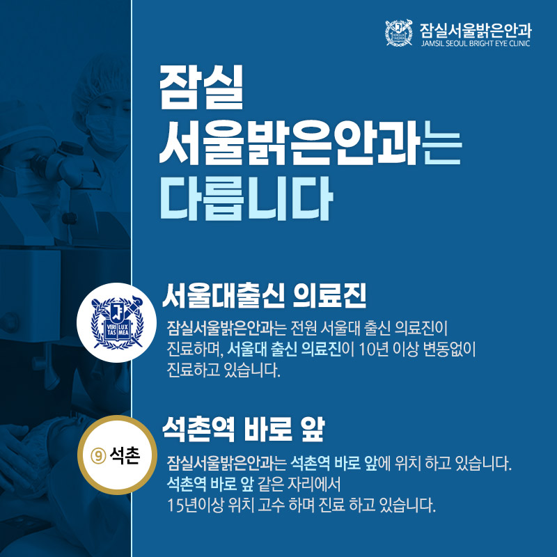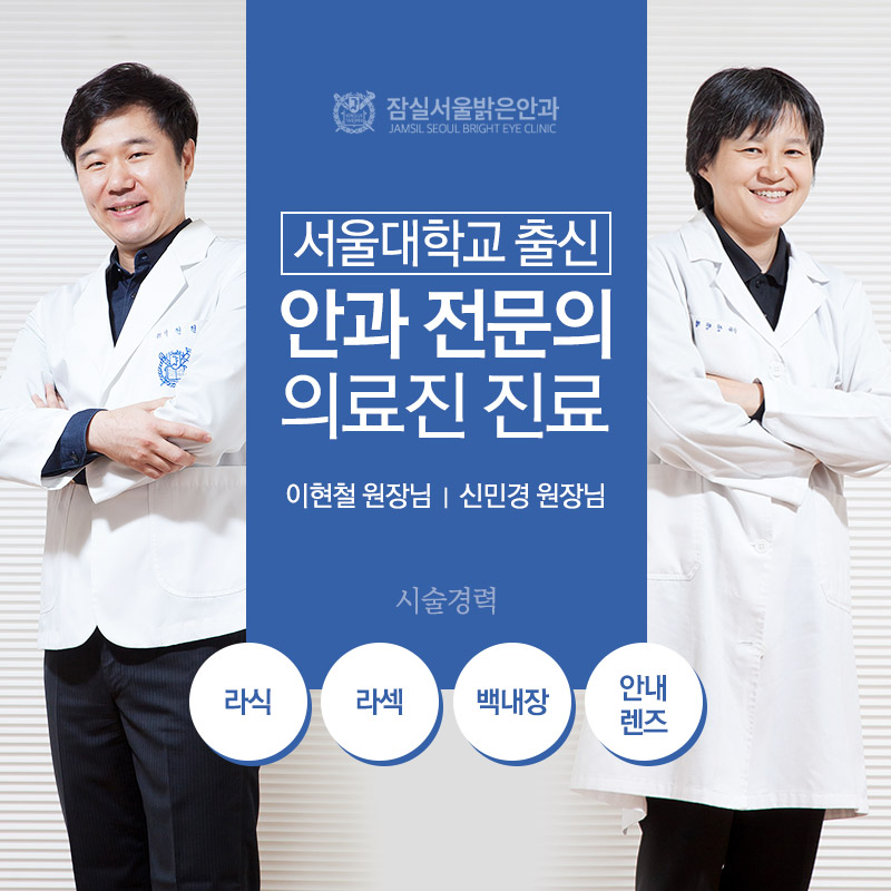 본원은 모두 서울대학교 출신 의료진이 진료하고 있었습니다 10년 이상 변하지 않고 진료하고 있기 때문에 안심하셔도 됩니다. 노안, 백내장 외에도 라식, 라섹, 드림렌즈 등도 진찰을 받고 있었습니다. 또한 저희 병원은 15년 이상 석촌역의 눈앞과 같은 자리를 지켜왔습니다. 지하철역 바로 앞에 위치하여 대중교통을 이용해도 편리하게 내원할 수 있었습니다.