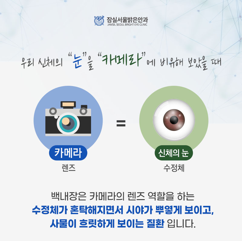 백내장은 수정체가 탁해지면 빛이 망막까지 도달하지 않아 시야가 마치 안개가 낀 것처럼 흐릿하게 보이는 증상을 말합니다.
