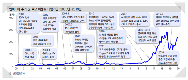 99년 Ge Force256 시리즈로 다시 한번 전성기를 구가한 엔비디아는 3DFX사와의 경쟁 끝에 결국 시장을 선점, 2000년 3DFX사를 인수하고 그해 마이크로소프트사의 대표 게임 콘솔인 XBOX에 GPU를 공급하면서 세계 최초로 노트북용 GPU를 선보이기 시작했다.■컴퓨터 부품업체들이 4차산업 중핵기업으로