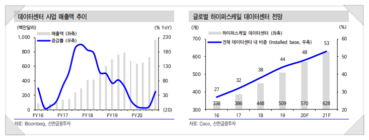 향후 머신러닝, 딥러닝, 추론형 인공지능 탑재가 빠르게 늘고 있는 점을 감안하면 GPU 기반 가속 플랫폼은 HPC(초고성능 컴퓨팅)와 인공지능 분야에서 필수 탑재되는 핵심 기술로 떠오를 것으로 전망된다. 따라서 데이터센터 부문은 중장기적인 성장동력을 확보한 것으로 판단되며, 향후 성장성도 매우 높을 것으로 기대된다.