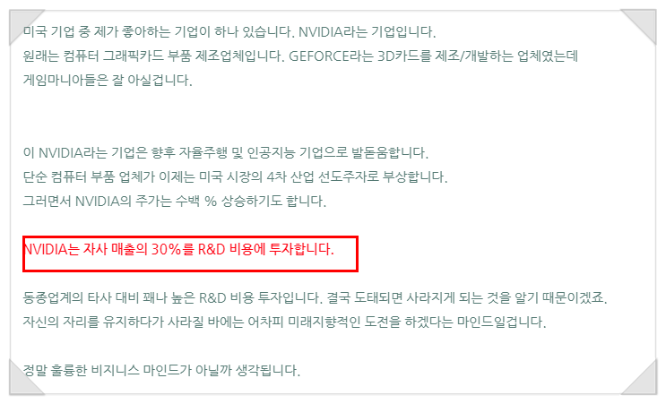 <J. 퓨처 블로그 칼럼 <주식투자는 사업이다>에서>