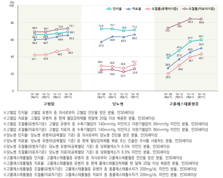 고혈압, 당뇨병, 고콜레스테롤혈증은 인지율, 치료율, 조절률이 나타나는데 고혈압 인지율은 69.1%, 치료율은 65.3%, 유병자 조절률은 48.3%, 치료자 조절률은 73.1%로 2007년 이후 10년간 큰 변화가 없다(만 30세 이상 2016-2018년 통합). 당뇨병 인지율은 71.5%, 치료율은 66.2%, 유병자의 조절률은 31.1%, 치료자의 조절율은 25.8%였다(만 30세 이상, 2016-2018년 통합). 당뇨병 치료율은 지속적으로 개선됐지만 조절률은 다른 만성질환에 비해 낮은 수준이다. 고콜레스테롤혈증 관리지표는 지속적으로 개선되어 고콜레스테롤혈증 인지율은 60.1%, 치료율은 50.3%, 유병자 조절률은 43.1%, 치료자 조절률은 84.0%였다(만 30세 이상, 2016-2018년 통합). 고혈압, 당뇨병에 비해 인지율과 치료율은 낮지만 치료자 가운데 조절률은 높았다.