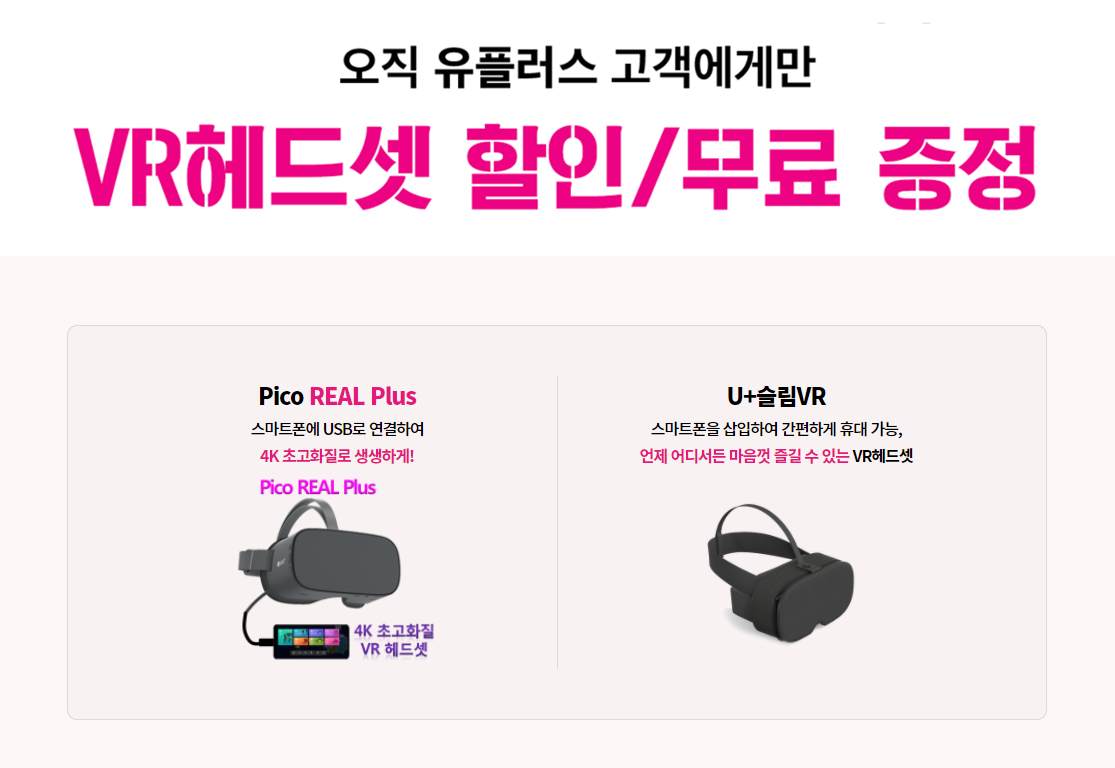 나는 5G 스마트 요금을 사용하고 있기 때문에 U+슬림 VR을 신청하려면 무료 Pico Real Plus를 신청하려면 10만원을 추가로 내야 한다 그곳에서 무료로 받을 수 있는 슬림 VR 신청