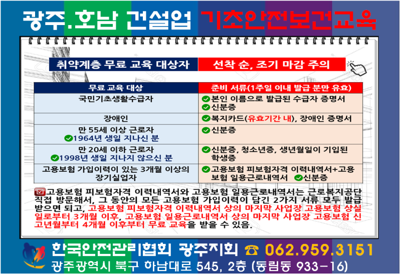 광주건설 기초안전교육 취약계층에 한해 무료교육도 진행하고 있습니다.조건을 살펴보시고 해당되는 경우 관련 서류를 가지고 방문하시면 무료로 교육받을 수 있습니다.단, 무료교육은 예산 소진 시 조기 마감될 수 있음을 참고하시기 바랍니다.자세한 내용은 교육원에 문의하십시오!