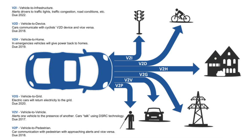 이러한 무선통신 기술이 효과적으로 작동하기 위해서는 자율주행차가 차량 및 기타 클라우드 기반 네트워크와 함께 차량 내에서 내부 시스템 및 엔터테인먼트 시스템, 외부 주변 인프라, 다른 도로의 사용자가 소유한 장치, 그리고 다른 차량과 통신할 수 있어야 합니다.