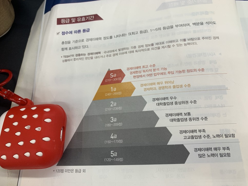 그러면서 경제/경영 지식을 인정받는 테셋 자격증을 소지한 지원자를 우대한다고 해도 저도 뒤쳐지지 않아 공부를 하게 되었습니다.한경 TESAT란? TESAT는 한국경제신문에서 시행하는 국가공인 민간자격시험입니다.응시자격에 제한은 없으며 누구나 응시할 수 있습니다.성적 커트라인은 테셋 등급별로 다르지만 시험은 S급, 1급, 2급, 3급, 4급, 5급까지 점수별로 급수가 구분되어 있어 본인이 목표로 하는 급수를 설정하여 학습하는 것이 필요합니다.