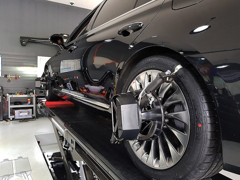 마무리 작업으로 3D 휠 얼라인먼트~! 보다 정밀한 수치를 보고 차량 하부 캠버, 토우, 캐스터 등의 전문성을 엔지니어가 조정하여 바퀴를 정렬시켜 차량 쏠림 및 편마모를 예방하는 작업입니다.