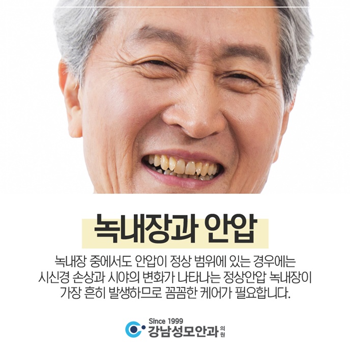 녹내장과 안압의 관계는?녹내장 중에서도 안압이 정상 범위에 있는 경우에는 시신경의 손상과 시야의 변화가 나타나는 정상 안압 녹내장이 가장 잘 발생하므로 세심한 관리가 필요합니다.