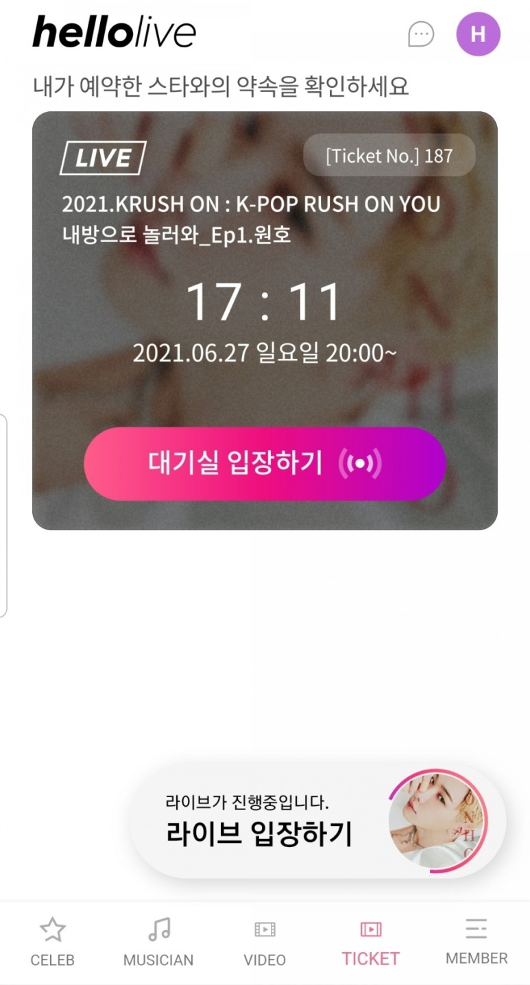 라이브 시간이 정해지면 티켓 메뉴를 통해 30분 전 대기실에 입장할 수 있다.