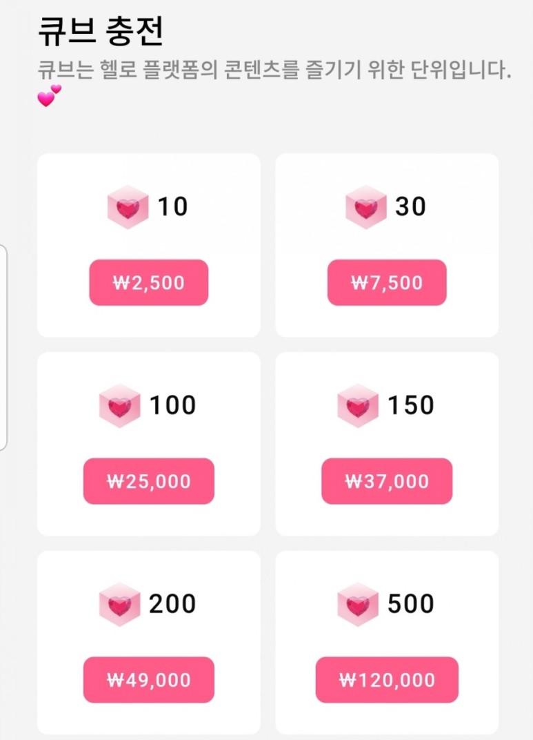큐브 시스템을 이용해 큐브를 결제하고 큐브를 이용해 사이트/앱 내에서 콘서트나 팬미팅을 구매할 수 있다.
