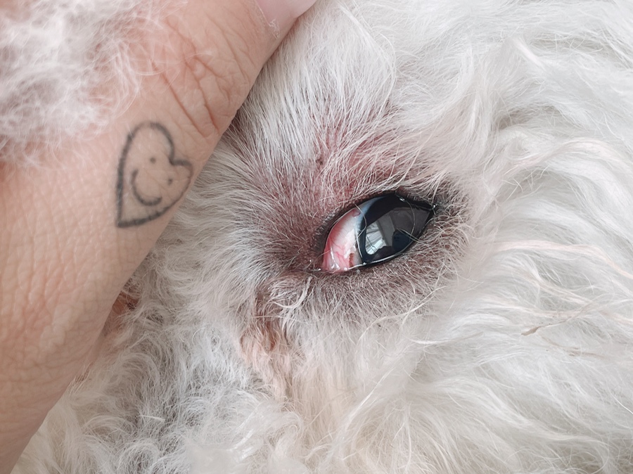 각막궤양은 상처나 먼지 등으로 인해 생길 수 있으며 눈을 잘 뜨지 못하고 눈을 감는 행동을 보이며 심하면 육안으로 움푹 들어간 상처 등을 확인할 수 있습니다.통증이 동반되는 경우가 많아 민감해지고 눈물의 양도 많아지고 눈곱도 많아집니다.