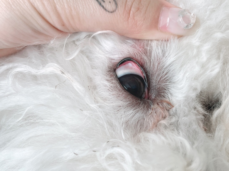 가장 흔한 것은 결막염으로 눈이 충혈되고 배꼽이나 눈물이 심해지는 증상이 나타나며 가려움증, 통증이 있을 수 있기 때문에 앞발로 긁거나 바닥에 이불에 섞는 행동을 보입니다.