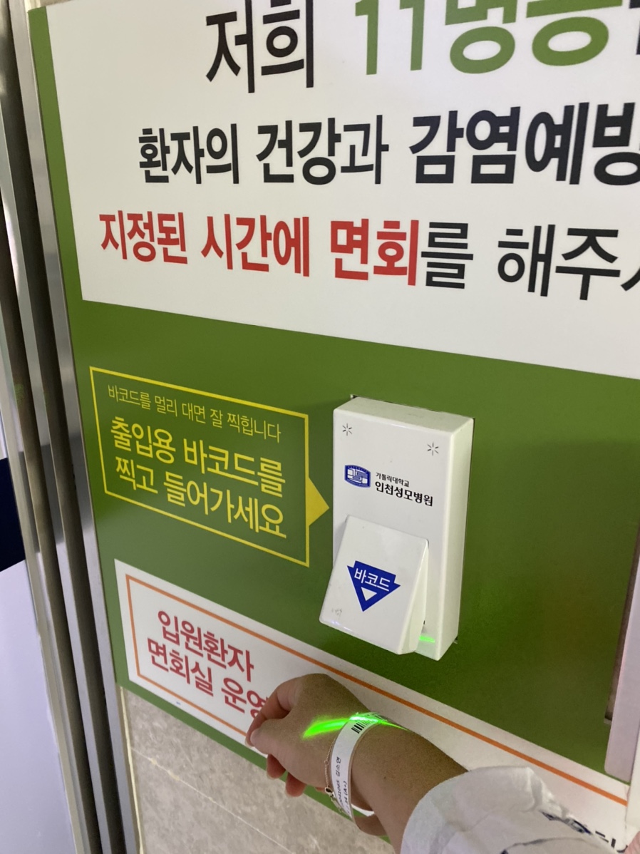 입원 수속 처리 시 환자와 보호자의 팔찌를 각각 1장씩 나눠준다. 이걸 붙이고 각 층 입구에서 바코드 찍고 들어가.