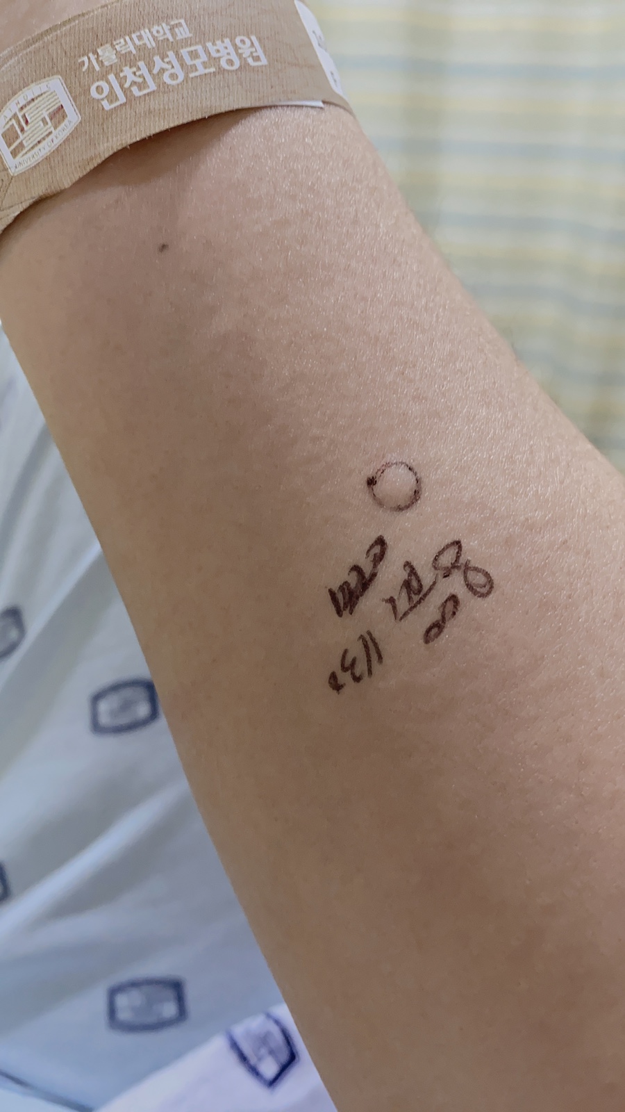 수술 당일 자정부터 단식해야 한다고 했다. 잠시 후 항생제 반응 테스트를 했다. 만약 붓거나 가렵거나 이런 부작용 반응이 있으면 다른 항생제를 쓴다고 한다.