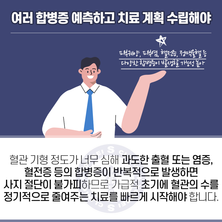 그러나 뼈, 근육 속과 같은 심부조직 속의 혈관을 치료해야 하는 중증도의 경우 각종 후유증이나 합병증을 미리 예측하여 치료계획을 세워야 합니다. 특히 뼈가 과도하게 증식하여 길이에 큰 차이가 있는 경우, 사지단축수술 등 정형외과적 치료가 필요할 수 있습니다. 또한 혈관기형정도가 너무 심해 평범한 일상생활이 불가능하고 과도한 출혈 또는 염증, 혈전증 등의 합병증이 반복적으로 발생하는 경우에도 사지절단이 불가피하므로 가급적 초기에 혈관 수를 정기적으로 줄이는 치료를 빠르게 시작해야 합니다. KT증후군으로 혈관의 굵기가 굵어지고 혈관의 단위면적당 밀도가 높아지는 것이 특징이기 때문에 초기질환으로 고치지 않으면 피부궤양, 피부염, 혈전증, 정맥울혈 등 각종 합병증이 발생할 가능성이 높아지므로 조기 정확한 진단을 통한 대처가 중요합니다.