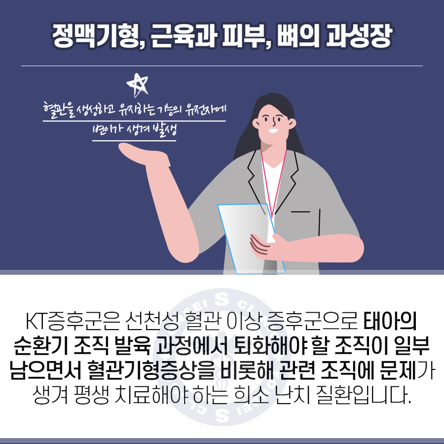 질환은 선천성 혈관이상증후군으로서 정맥, 모세혈관, 림프관의 증식으로 인해 그 신체부위가 과도하게 성장하는 희귀질환입니다. 10만명당 한명씩 나타나는 질환으로 몸 속 혈관을 생성하고 유지하는 기능을 하는 유전자에 변이가 생깁니다. 통상 혈관 이상 발육, 하지 정맥류 또는 정맥 기형, 근육과 피부, 뼈의 과성장 등 3가지 중 2가지 이상의 특징을 갖고 있으면 KT 증후군으로 진단할 수 있지만 태아의 순환기 조직 발육 과정에서 퇴화해야 할 조직이 일부 남아 혈관 기형 증상을 비롯한 관련 조직에 문제가 생기는 증상으로 평생 치료해야 할 난치병입니다.