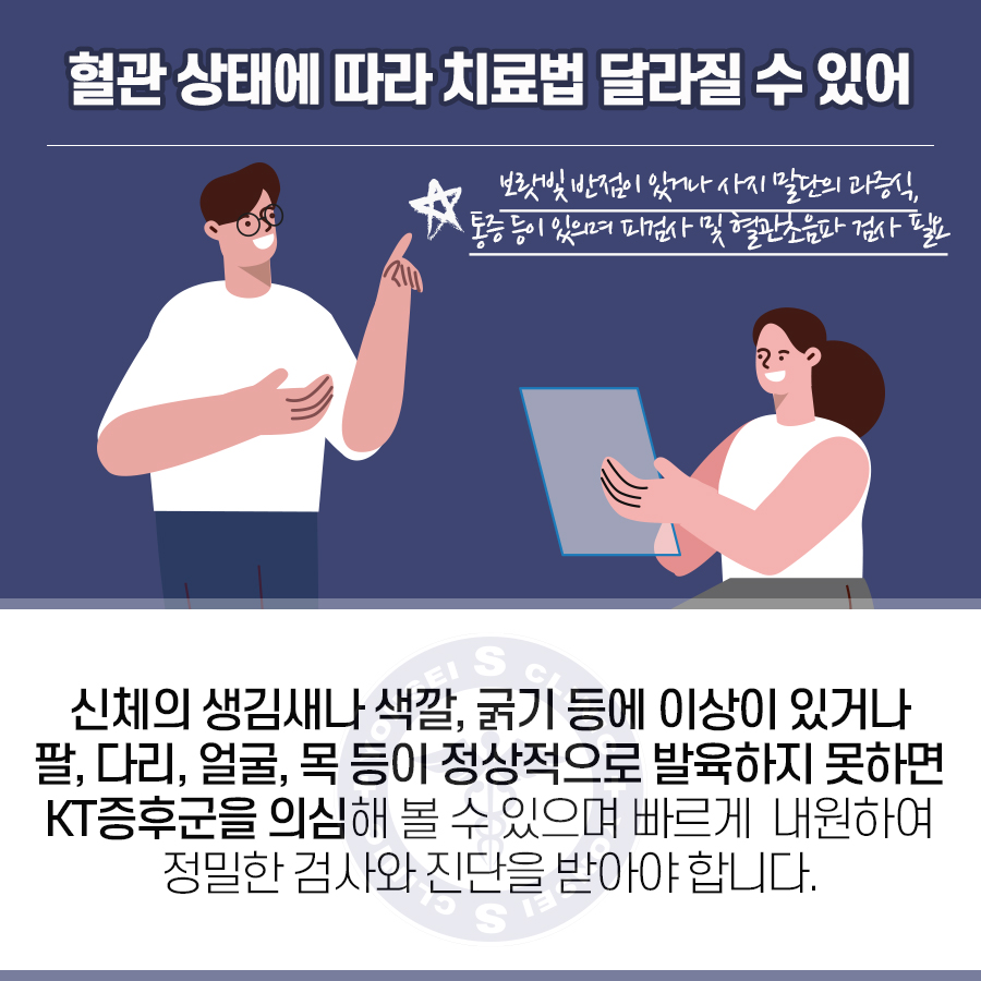 일반 신생아나 영유아기에 신체형태, 색깔, 굵기 등에 이상이 있거나 팔, 다리, 얼굴, 목 등이 정상적으로 발육되지 않으면 연세예수의원 전문의에게 즉시 정밀검사와 진단을 받도록 합니다. 의심되는 증상으로는 보라색 반점이 있거나 사지 말단의 과증식, 통증 등이 있으며, 피검사 및 혈관 초음파 검사를 통하여 KT 증후군을 진단합니다. 경증이라면 연세에스병원에서 하지정맥류 시술과 마찬가지로 피부와 근막간 연부조직에 존재하는 가느다란 모세혈관을 초음파로 보면서 폐쇄시키는 방법으로 초음파 유도 하혈관 경화요법으로 치료할 수 있으며 경우에 따라서는 정맥 추출 수술, 레이저 혈관 응고 수술이 필요할 수도 있습니다.