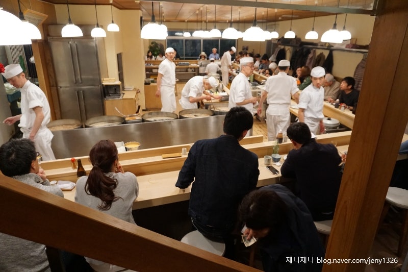 内部はキッチンが大きく真ん中に位置し、キッチン外郭の三面に沿ってバーテーブルがぐるりと囲まれている。 そのため、中で揚げる姿、切る姿、サービングする姿などキッチンを詳しく覗くことができる。 これもまた見る楽しみがある。 内側のバーテーブルから人がいっぱいになり始め、私たちは途中で席が戻ってきた。 メニューにいろんなメニューがずっと書いてあったけど、日本語が下手な私はこんなに日本語さえあれば戸惑う。 それでメニューもあらかじめ勉強して行き、言いたいこともできれば決めていた。