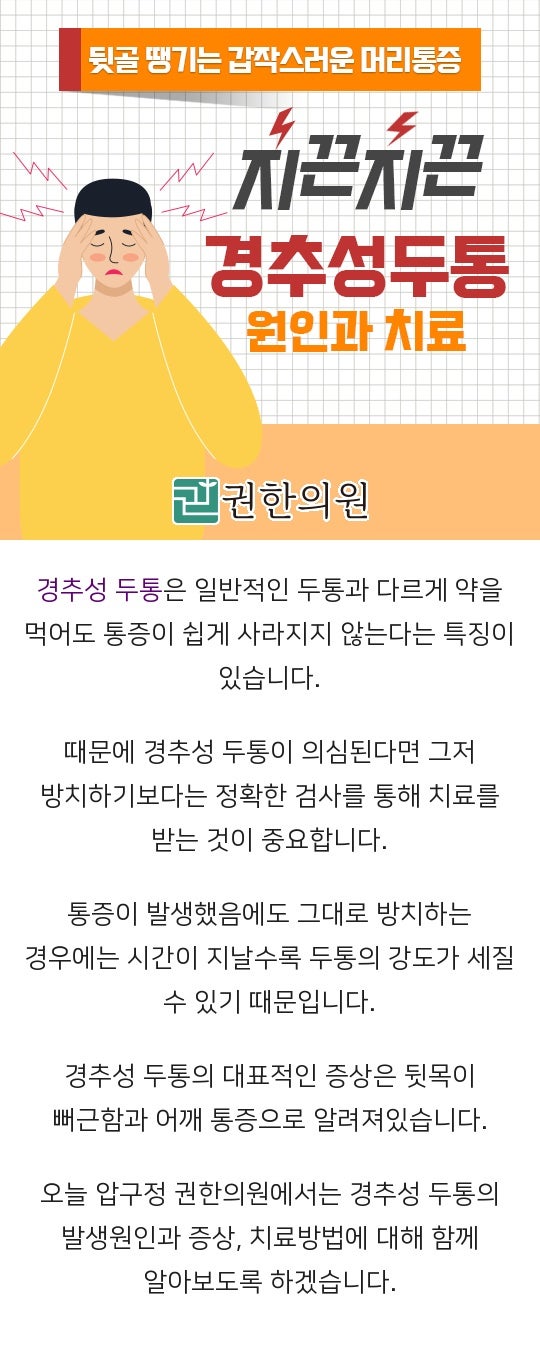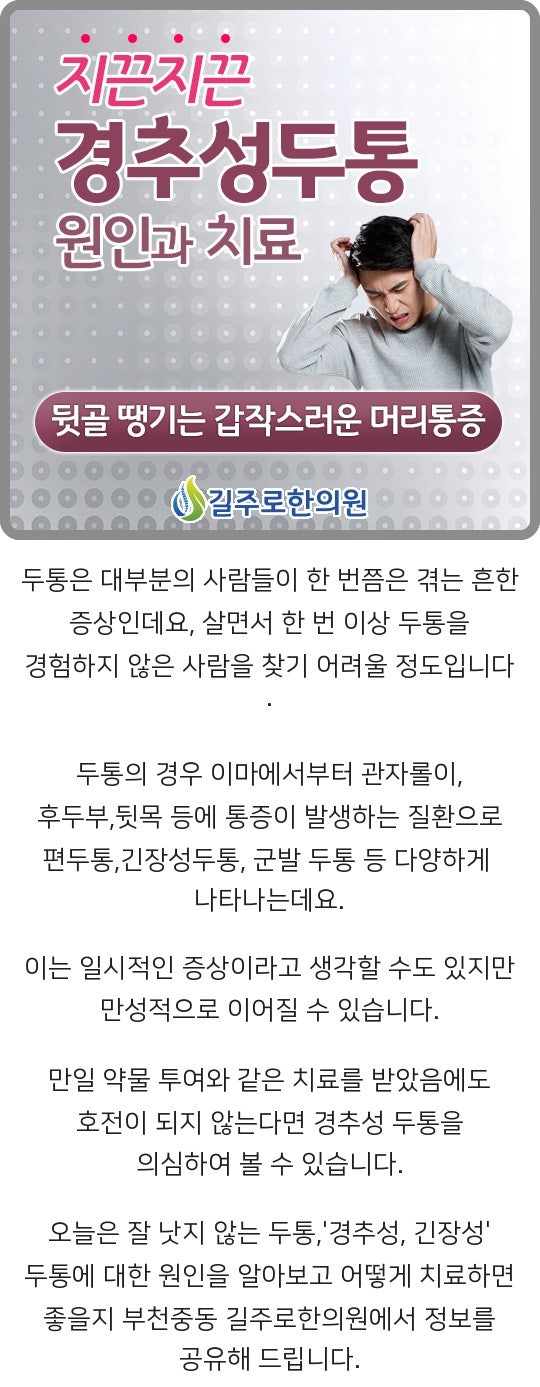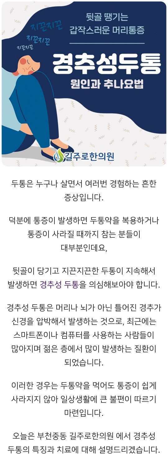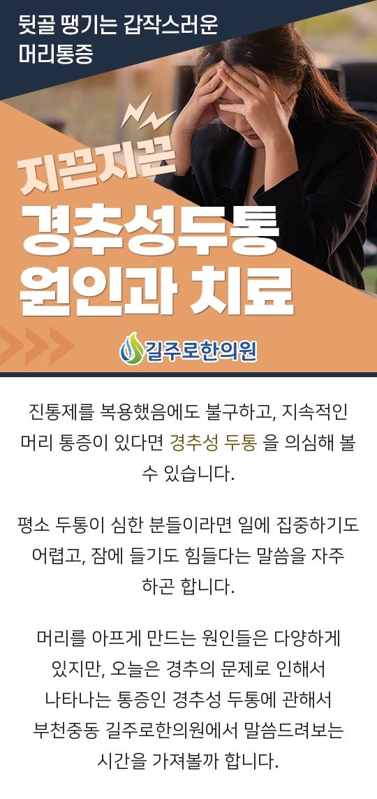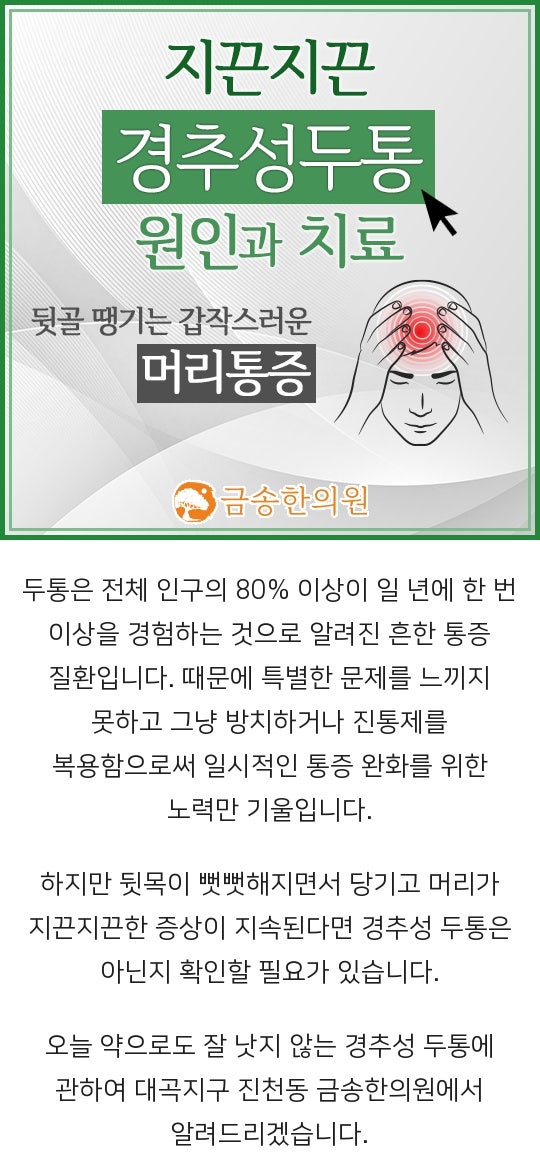 목의 관절에 관여하는 근육은 대부분 두개골에 이어지고 있습니다. 목이 피로하면, 목과 두개골을 잇는 근육에 심각한 피로감을 주고 이것이 두통에 연결됩니다. 만성적인 두통은 일상 생활에 큰 지장을 줍니다. 두피와 목에 끼고 경미하고 둔한 통증, 심한 시큰거리거나 고통스러운 긴장성 두통이 있어도 두통은 당신이 느끼는 것을 방해하는 것이 있습니다.처방전 없이 구입할 수 있는 진통제는 두통과 관련한 아픔을 일시적으로 완화할 수 있지만 문제의 근원에 도달 못하고 실제로 두통을 일으키는 원인을 해결할 수 없어요.이것이 많은 사람이 두통 해소하기 위한 추나 요법을 받는 이유입니다. 추나 치료는 두통의 통증을 없애는 것은 물론이고 원래 두통의 원인을 실제로 치료하는 안전하고 효과적인 해결책입니다. 실제로 연구에 따르면 정기적인 추나 치료는 가장 일반적인 타입의 두통에 효과적인 치료법입니다. 여기에는 편두통, 긴장성 두통, 목구멍 통증 등이 포함됩니다. 두통에 대한 자연에서 지속적인 완화를 찾고 있다면 추나 치료가 여러분이 찾던 해결책이 될지도 모릅니다.