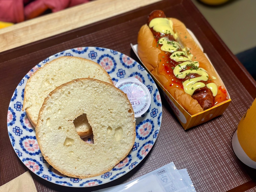 플레인 베이글을 잘라 굽는데 크림치즈를 발라 먹으면 고소하고 맛있습니다.그리고 칠리갈릭 핫도그는 소스는 물론 할라피뇨가 가득해서 너무 좋았어요.