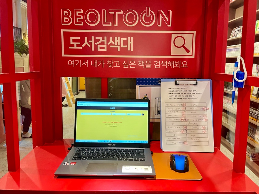 이 빨간 부스는 도서 검색대에요! 보고 싶은 특정 책이 있으면 여기서 바로 검색하는 것도 시간 절약 팁!