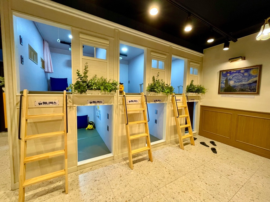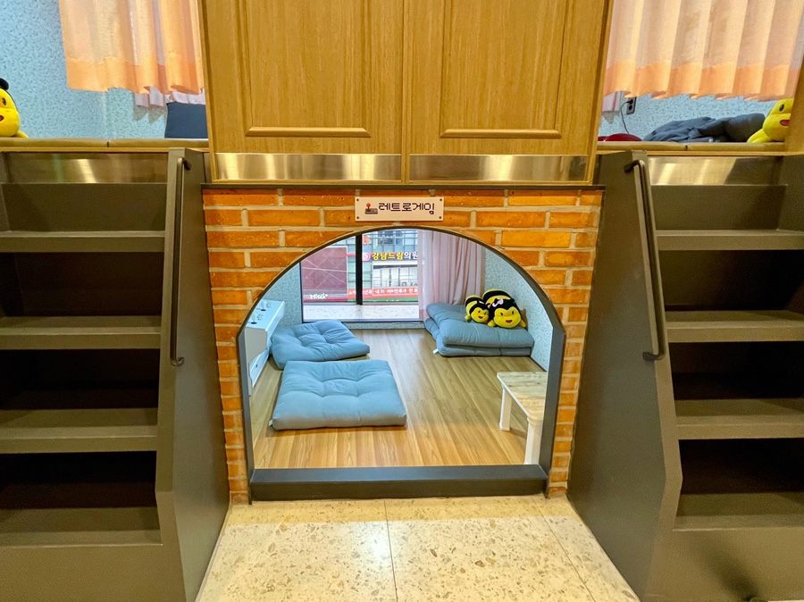 아까 그 레트로 게임방 빼고는 모든 방바닥이 푹신푹신해요! 레트로 게임방은 방석이 있고 다른 방에는 등받이 쿠션이 있어요^^