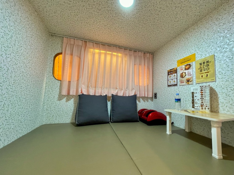 입구에서 제일 가까운 방이에요! 여기 2층에는 안마기가 구비되어 있어서 넓었어요! 저 빨간 안마기에 발을 넣고 안마받으면서 책을 읽으면 나른해져서 졸리겠다…(웃음)