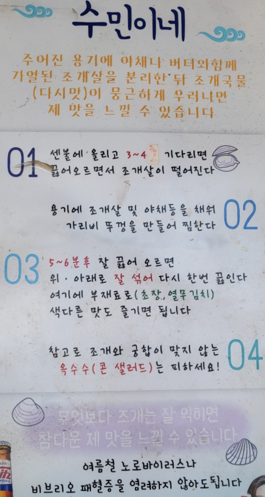 조개를 굽는 방법이 벽에 붙어있기 때문에 설명대로 구우면 맛있게 먹을 수 있습니다