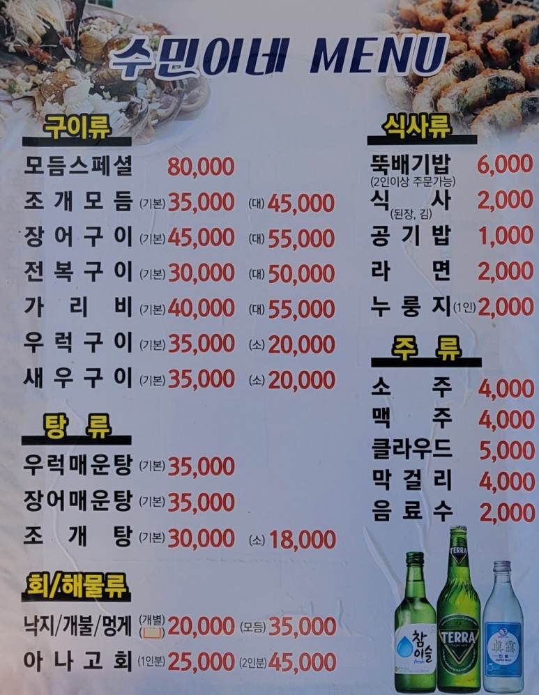 주문시 ” 메뉴 위부터 아래까지 모두 주세요. ” 라고 말하고 싶었어요 조개, 가리비, 장어, 전복 고민 안 하고 다 먹고 싶었어요