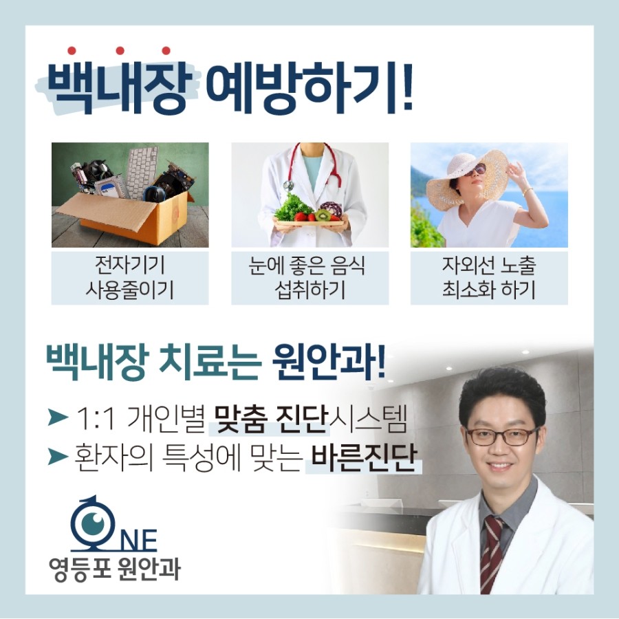 재발이 아닌 간단한 레이저 시술로 회복이 가능합니다.백내장을 예방하는 방법은?먼저, 스마트폰, 컴퓨터와 같은 전자기기를 사용하는 시간을 줄이는 것이 필요합니다.