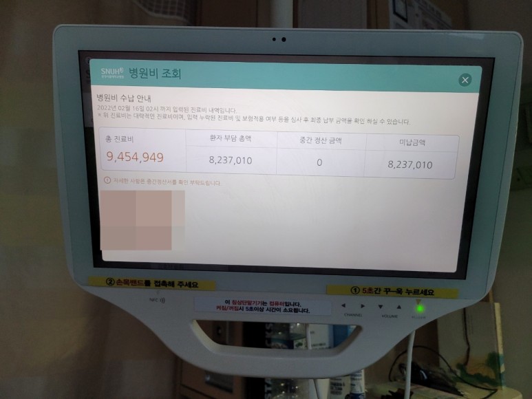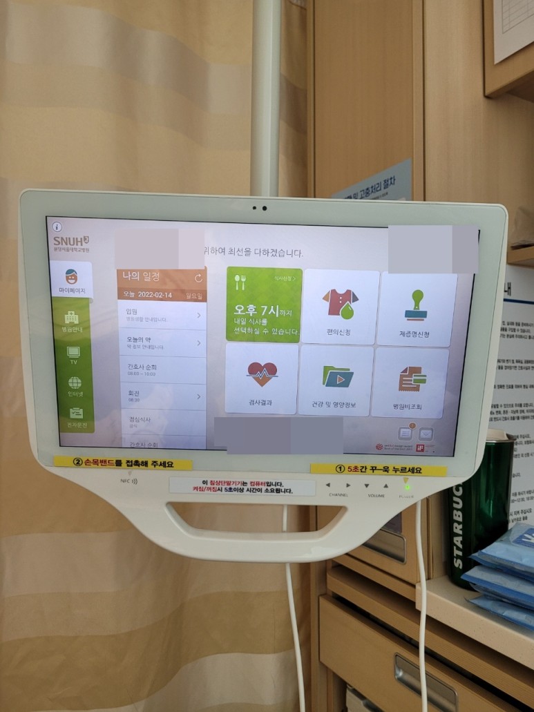 그리고 환자용 개별 TV가 있는데 여기서 식사 메뉴, 투약 정보, 치료 과정, 병원 비용 등을 실시간으로 확인할 수 있어서 아주 좋습니다.TV도 볼 수 있어요
