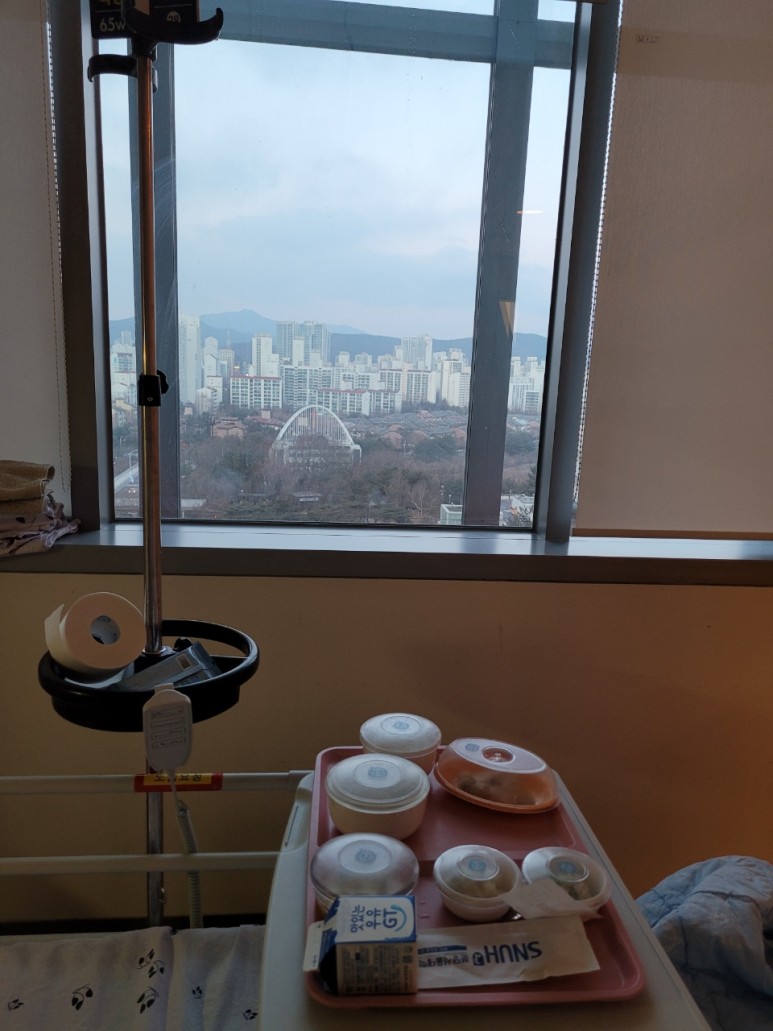 저는 유방, 자궁 정기검진을 받으러 가서 담당선생님께서 갑상선도 한번 받아보라고 하셔서 갑상선 초음파를 받고 0.7cm 결절을 발견했고 그래서 갑상선암 증상 같은 건 전혀 없는 경우입니다. 좀더 자세히 알아보려면 산부인과 말고 유방영상의학과가 있는 2차병원으로 가라고 해서 2차병원에서 세침검사를 받고 거기서 갑상샘암 판정을 받아 다시 삼성서울병원에서 확인을 한 뒤 최종적으로 분당서울대병원에서 갑상샘암 수술을 받았습니다. 코로나 때문에 들러리 없이 간호병동에 혼자 있기를 원해서 2인실-1인실-5인실 순으로 부탁했는데, 무실이라 간호병동 5인실에 있었어요. 다행히 사진에서 볼 수 있듯이 창가 쪽이고, 5인실인데 양쪽 공간이 넓어서 병실은 같은 방인데 만족했습니다.