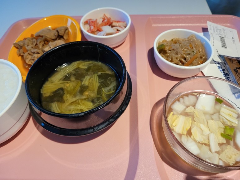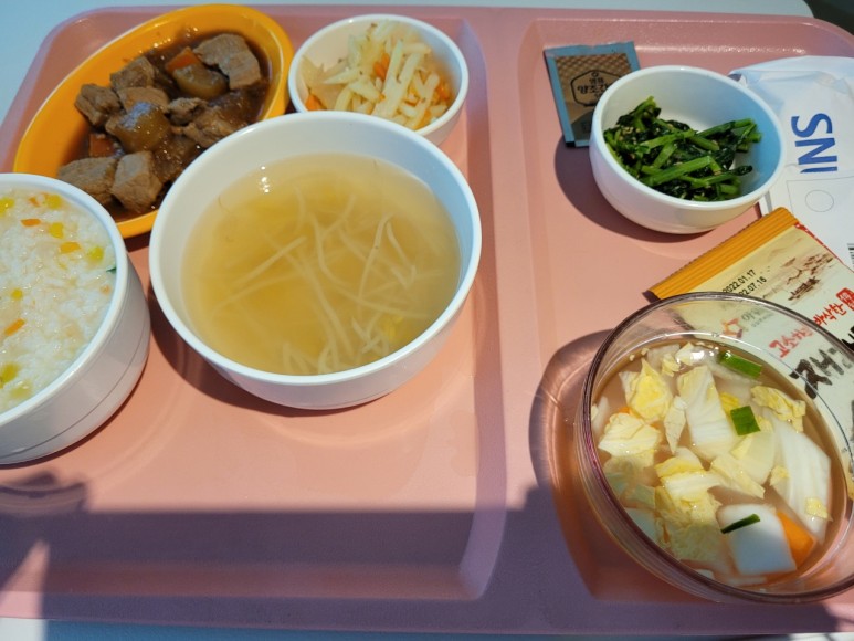 신디록신을 처음 먹어봐서 시간 계산을 할 수 없었습니다만, 식전 30분은 최소한의 공복 상태를 만드는 것 같네요. 병원식이 7시 반에 나올 줄 몰라서 밥을 늦게 먹었지만 분당서울대병원은 환자식을 가져다주고, 다 먹은 것도 갖다주고, 늦게 먹어도 다 치워줘서 정말 감사했습니다. 오늘도 남김없이 다 먹었습니다. 목은 여전히 아파요. 하지만 배가 고프지도 참을 수도 없기 때문에 배를 선택했습니다. 특히 제가 갑상선암 수술 후 좋아하게 된 반찬이 있는데요, 그것이 바로 물김치입니다. 확실히 차가운 음식이 들어가면 고통이 덜해지는 느낌이에요. 퇴원 후 물김치를 주문해서 매끼 먹고 있습니다.