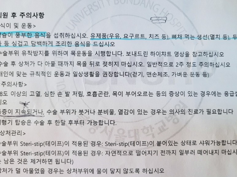 몇 달 전에 뉴스에서 갑상선암 보험금을 앞으로 줄여나갈 방침이라고 담당 보건사에게 물었더니, 저까지는 그래도 원래대로 받을 수 있을 것 같다고 했지만 국가가 어떻게 결정하는지 모르기 때문에 지켜보지 않으면 안 된다고 했습니다. 병원에 있으면 아픈 사람만 있기 때문인지 모르지만 우리 나라에는 정말 아픈 사람이 많네요. 분당서울대학병원에도이렇게나있으니다른병원까지합치면참아픈분들이많구나.하는마음으로이렇게수술을받아서무사히퇴원하게된것에대해감사드리려고했습니다.