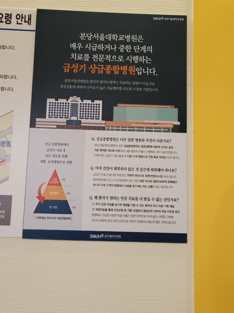 병실에서 밤새 구토하고 울고 이틀 연속 아비규환 상태에서 도저히 잠을 잘 수가 없어서 통로를 걸으면서 운동을 했어요 하루에 한 시간밖에 못 잔 것 같아요. 걷다 보면 이런 안내판이 있네요. 서울대병원은 상급병원이다, 즉 더 이상 있고 싶어도 있을 수 없다 라는 내용이에요. 코로나라는 오히려 병원 안이 안전할 것 같아서 더 아팠는데 안 되겠대요.